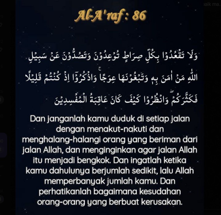 بِسْــــــــــــــــــمِ اللهِ الرَّحْمَنِ الرَّحِيْ Terjemahan sebelumnya ,…orang yang zalim….(yaitu) orang-orang yang menghalang-halangi (manusia) dari jalan Allah dan menginginkan agar jalan itu menjadi bengkok, dan mereka kafir kepada kehidupan akhirat.” (Q.S Al-A’raf [7] : 45) وَلَا تَقْعُدُوْا بِكُلِّ صِرَاطٍ تُوْعِدُوْنَ وَتَصُدُّوْنَ عَنْ سَبِيْلِ اللّٰهِ مَنْ اٰمَنَ بِهٖ وَتَبْغُوْنَهَا عِوَجًاۚ وَاذْكُرُوْٓا اِذْ كُنْتُمْ قَلِيْلًا فَكَثَّرَكُمْۖ وَانْظُرُوْا كَيْفَ …